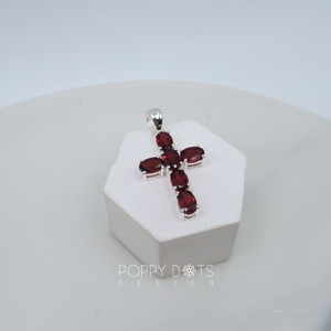 Deep Red Oval Garnet stones form a graceful cross - a symbol of faith, hope, and enduring elegance. Handcrafted in sterling silver to be treasured for a lifetime.