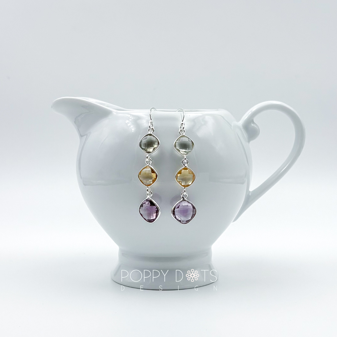 Sterling Silver green and purple Amethyst and Citrine Quartz Triple Earrings