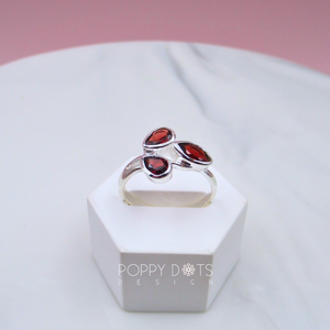 Nature meets fire in this striking sterling silver ring, featuring three garnets nestled in an elegant leafy design. Garnet’s bold red tones symbolise passion, love, and vitality, while the organic setting makes this piece both earthy and powerful. A true statement of strength and style. Garnet is also the birthstone for January.
