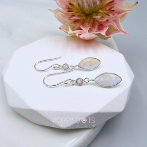 Elegant and mysterious, these sterling silver drop earrings feature elongated marquise-cut moonstones that shimmer with an ethereal glow. Known as the stone of intuition and new beginnings, moonstone reflects light beautifully, adding a touch of magic to every look. Perfect for daydreamers and romantics alike.